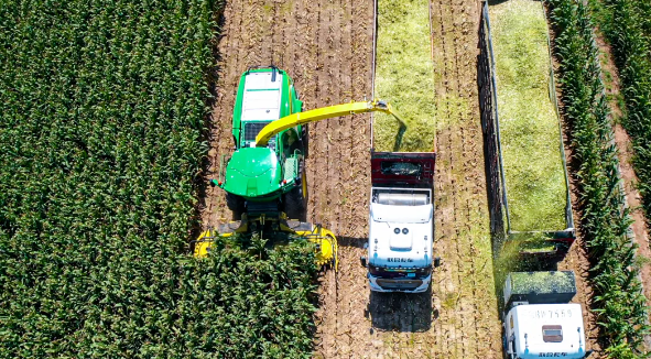 在位于宁夏中宁的渠口农场万亩青贮玉米单产提升示范区,大型玉米青贮收割机正穿梭在茫茫的“青纱帐”里交替作业,一排排玉米被快速整齐切割、粉碎,随后被抛入与收割机并肩前进的卡车车厢内。再经过卡车的交替转运后,青贮将直达各个牧场进行储存。该农场一天可收割青贮7000吨,预计收割青贮总量为7万吨,于9月15日前完成收割工作。1亩地青贮,可供一头奶牛吃6个月。