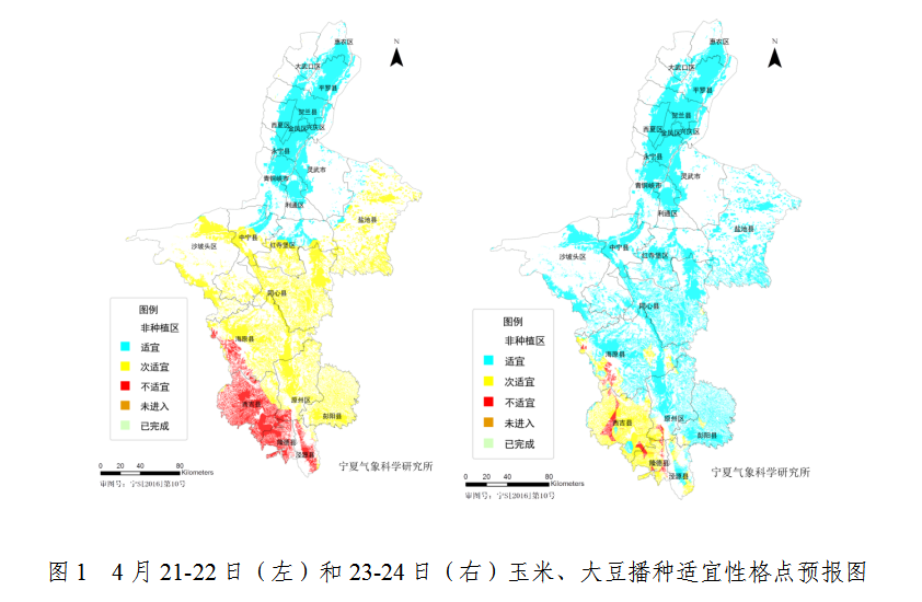 受前期降水和22日全区降温天气影响,21-22日中南部地区玉米、大豆等秋粮作物的春播气象适宜度等级为次适宜,灌区为适宜;23-24日气温回升,全区播种适宜度为适宜(图1)。
